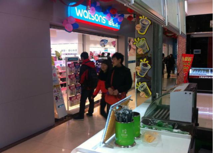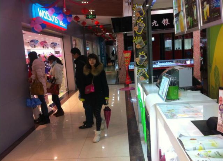 本店是全国加盟店。位于光谷步行街一期。位于整个商圈中庭部位。麦当劳。屈臣氏。摩提工坊。各种包包服饰。小吃都有。是7字形门面。正面有3.8M的门头。侧面有1.5M的门头。建面14平。还有个2平左右的小仓库。店子就位于楼梯旁。位于屈臣氏的进口处。离屈臣氏口子不到2米。